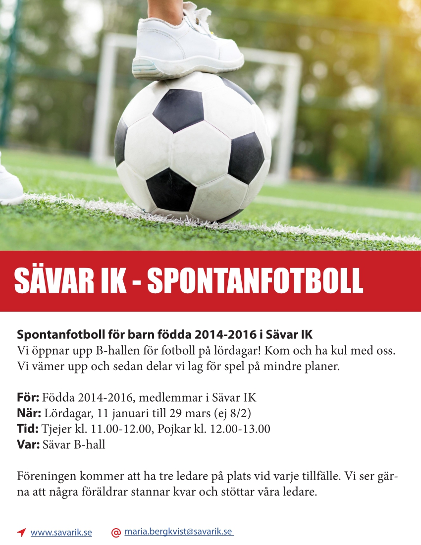För barn födda 2014 till 2016 pågår det fortfarande Spontanfotboll på lördagar i B-hallen. Datumen som är kvar är 1, 8, 15, 22 och 29 mars. Tidsschemat är följande: